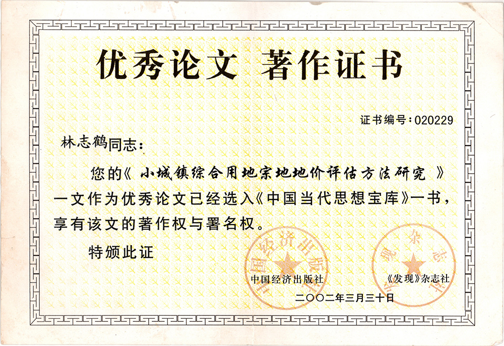 优秀论文著作证书
